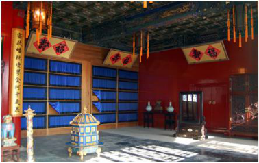 恭王府的多福轩中,殿内四壁靠近天花板的地方皆悬挂福寿字匾,这些福寿字均写于红色方纸之上(即“斗方”)呈梭形摆放,一福一寿成对制成匾额。按惯例,旧年的福寿字斗方不能揭去,而是将新赐的福寿字斗方直接贴在旧的上面,取“增福添寿”之意。