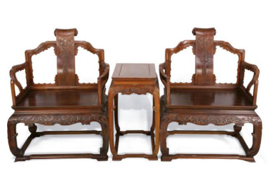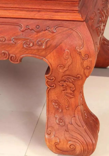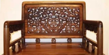 这里的龙纹是指螭、夔等。明代黄花梨玫瑰椅上曾见“六螭捧寿”的图案,该椅的靠背板透雕六螭捧寿,应是明代少见的大量使用雕工的黄花梨家具。到了清代,纹饰的搭配变得更加多样,蝠纹和螭、夔等龙纹始见于同一家具上,含义也变得丰富起来。清代一些家具上出现过雕双夔龙及蝠纹、团寿字纹的例子;团寿字纹居中,双夔龙居两侧,蝠纹居上,含义也深化为“双龙捧寿”和“福寿成双”两层。明代家具上使用蝠纹的不多,多以雕刻螭、卷草等纹饰为主,倒是清中早期与晚期的蝠纹区别比较明显。清中早期蝙蝠纹变化不大,体量适中,翅膀打开的幅度略大,少数蝙蝠带有胡须,充满灵气。而晚期的蝙蝠,形体硕大,呆头呆脑,毫无生气,此可视为清代家具断代的依据之一。