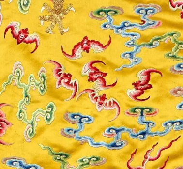 但蝠纹得到统治者的喜爱并不始于清朝,明代时,蝠纹就被用在了龙袍上,清代亦然。龙袍上的红色蝙蝠纹,发音与“洪福”相同,寓意着洪福齐天,较有代表性的一例是“清乾隆明黄绣五彩云蝠纹十二章吉服袍”,上绣红色蝙蝠和五彩云纹。所谓“上有所好,下必其焉”,蝠纹既然得到了天子的垂青,在权贵阶层中流行起来便不足为奇了。