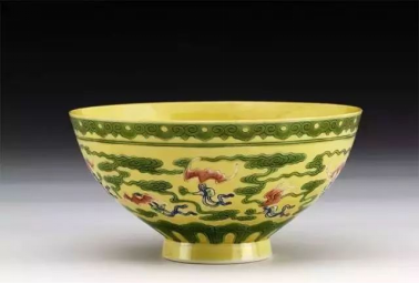 清雍正景德镇窑黄地粉彩刻花云蝠纹碗