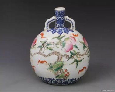 乾隆青花粉彩桃蝠纹双耳抱月瓶
