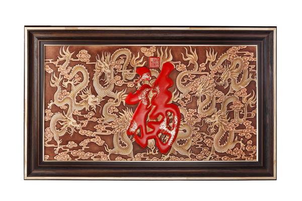 由上等头层黄牛皮制作。栩栩如生的九条龙与天下第一福完美结合,红福之上饰以黄金,寓意福气固若金汤、富丽堂皇。作品采用横幅构图,有亨福之意,寓意福运亨通,顺风顺水。