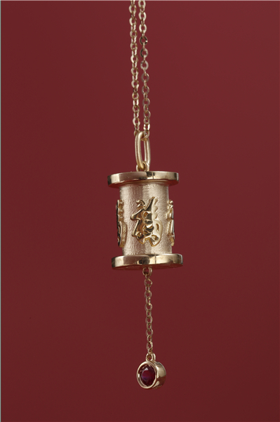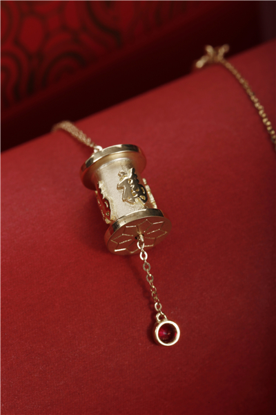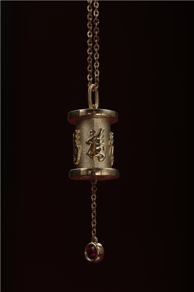 18k金红宝石项链,造型灵感来源于转经筒,项链上面刻有“天下第一福”,寓意美满吉祥、消灾避难。