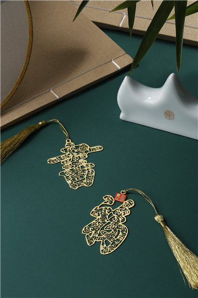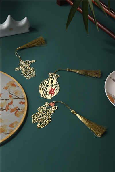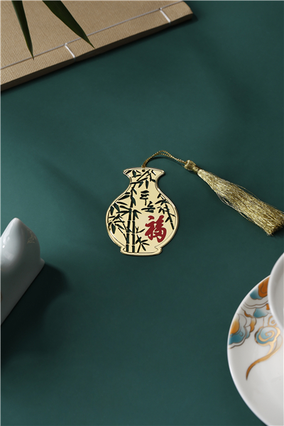 这三款书签均采用纯铜材质。瓶子型书签上面刻有竹子,寓意竹抱平安、节节高升。福字型书签内刻多种字型的福,又名百福书签,寓意福中有福。书字型书签名书中有福。小小书签蕴含着深厚的历史文化。