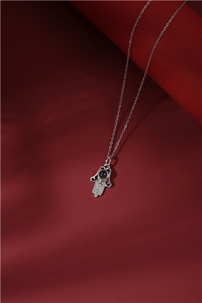 18k金材质,手工制作。以手作为造型,中央镶有人造宝石,宝石采用微雕工艺,刻有101个福字。项链上还镶嵌小钻石一颗,小巧精致,寓意福在手中、掌上明珠。