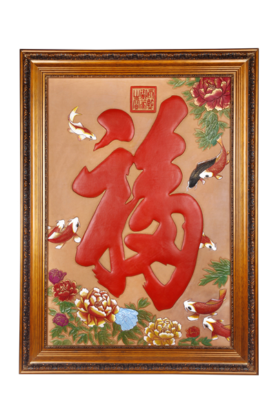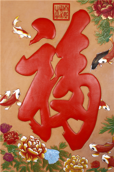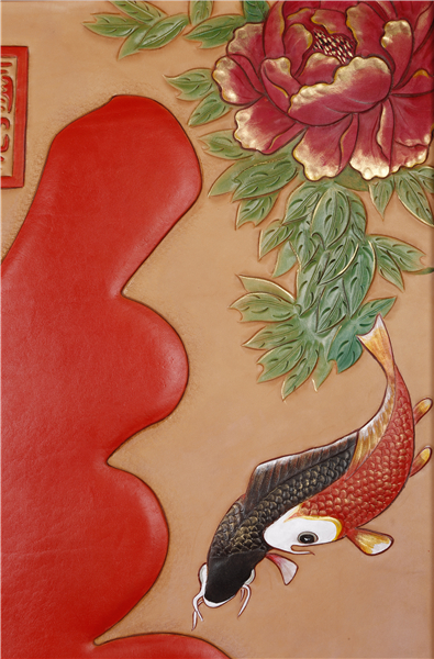 采用意大利上等牛皮纯手工精美雕刻,工艺细致。软浮雕曾是欧洲皇室贵族身份和名望的象征。牡丹代表富贵圆满,伴有红尾金翅自由自在的锦鲤,寓意家庭团圆美满,富贵安康。