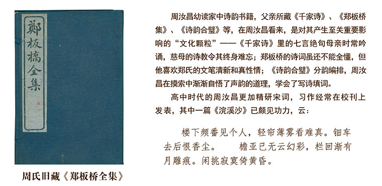 周汝昌诗词启蒙源于家庭环境的熏陶。父亲能诗善文,通达声律;母亲喜爱吟诵,循循启诱。幼年的周汝昌,聆听着母亲的吟叹,翻阅着家中的诗韵书籍,摸索中渐渐弄懂了韵脚和四声平仄的道理,始而模仿,继而创造,就这样学会了写诗填词。