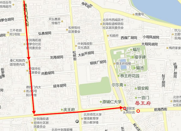 线路1:沿地安门西大街至前海西街北行,请按下图红色标识前行: