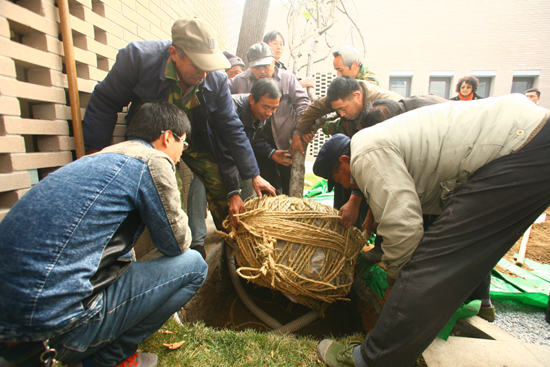 11月26日,恭王府管理中心向南开大学迦陵学舍移植了两棵树龄在10年左右的西府海棠。据有关记载,西府海棠最早即出自恭王府,是恭王府特有的树种。为了提高移植的成活率,结合迦陵学舍的空间布局,恭王府管理中心特地在花园里挑选了两棵地径约15厘米左右,树形相对丰满的海棠树用以移植。