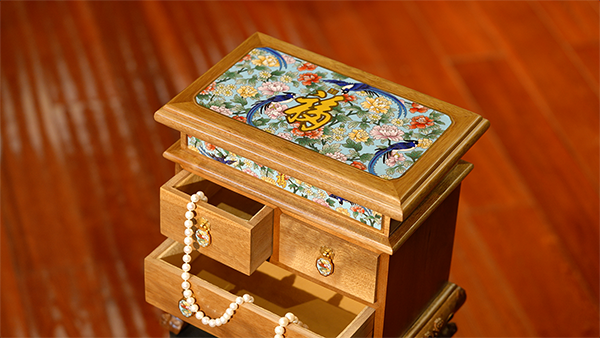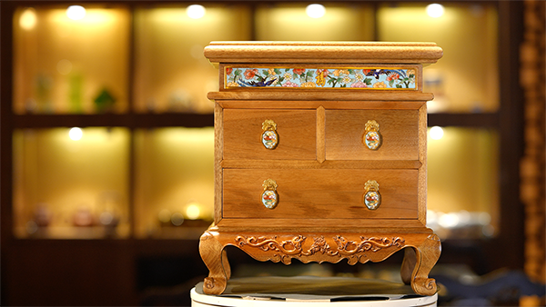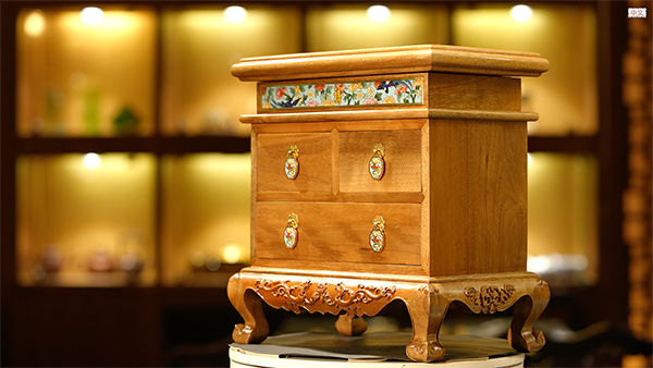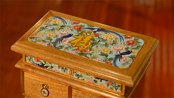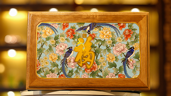 采用金丝楠木和景泰蓝掐丝等工艺制成。福柜谐音“福贵”,寓意富贵。富贵本自荣华见,与“天下第一福”巧妙结合,经金丝楠木的烘托,寓意荣华内敛、福气在柜,让人感受到端庄优雅和华丽绽放的碰撞。