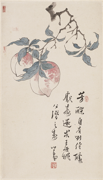 《寿桃》(纸本立轴),长159厘米,宽46厘米。 “芳醴自有刘伶酿,献寿还求王母桃。公潜之寿,心畬”,钤四灵“溥儒”印等。