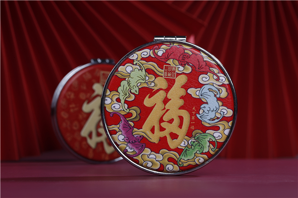 百福镜、五福镜,PU与铁石玻璃材质,精致小巧、携带方便、实用性强,寓意以福照人、福光满面。