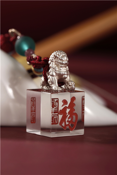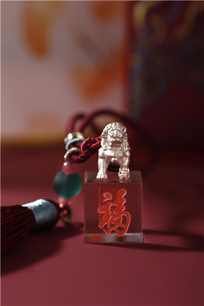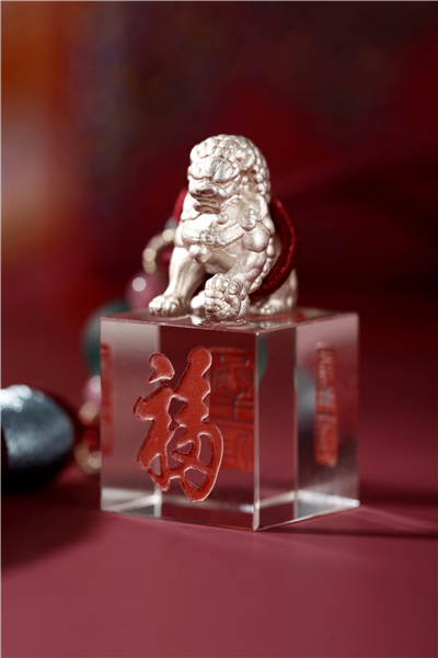 选用天然白水晶,晶莹剔透、触感微凉。水晶是佛教七宝之一,又称为摩尼宝珠,水晶的能量能净化人的身心。印章上为恭王府的神兽形象,印章底部可以雕刻文字。