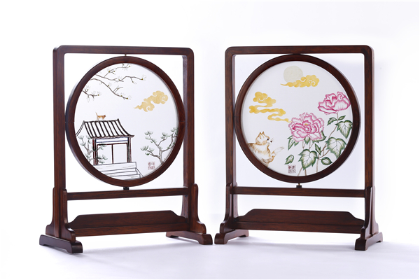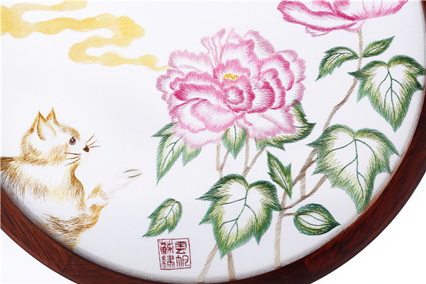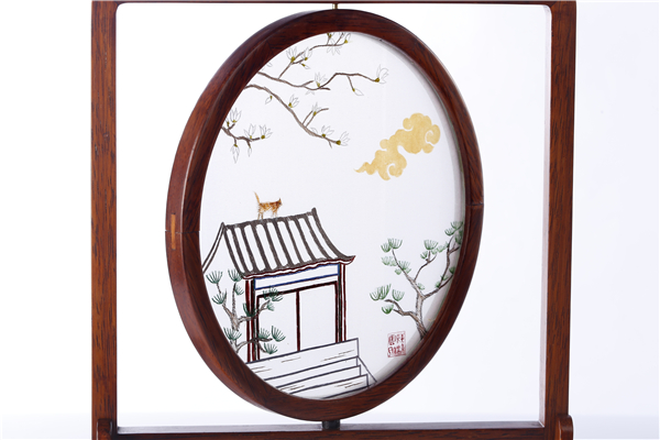 作品提取恭王府园内植物、建筑、动物等各类吉祥寓意元素为创作灵感,乱针绣与金粉手绘结合,展现恭王府吉祥猫大黄的日常生活。月下橘猫戏牡丹,寓意富贵安康、恬淡舒适的生活;橘猫走屋檐赏玉兰,寓意吉祥如意、青松常在。