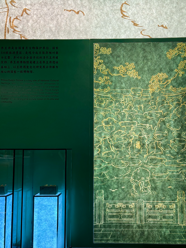 恭王府博物馆展区以独特的“恭博绿”为设计语言,生动再现了恭王府碧瓦朱甍、华美典雅的建筑意境。作为官式营造技艺典范,恭王府中路主建筑严格遵循《大清会典》中亲王府“覆绿琉璃”的礼制规范,这一传承二百余年的色彩密码及其背后的人文内涵,如今化作一抹典雅温润的绿调,成为“恭博礼物”设计的灵魂内核。