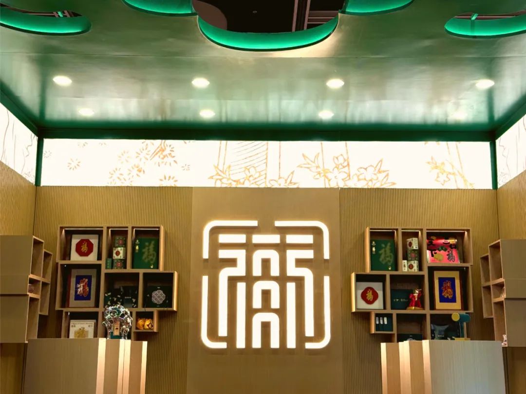 展区正门创新性地采用恭王府内抄手游廊的冰裂纹窗棂元素,顶部装饰的蝙蝠纹镂空造型则巧妙呼应了恭王府作为“万福之地”蕴含的深厚“福”文化内涵。引人注目的背景墙更是巧妙地将恭博馆标“福在府中”的恭王府建筑群空间造型转化为与公众间开放互动的展陈语言,展现出恭博在时空维度上不断延伸探索、推陈出新、与古为新的精神及开放共享的格局。观众步入整个展区,仿佛打开了一只巨型“绿盒子”,可以尽情沉浸在琳琅满目的“恭博礼物”之中。