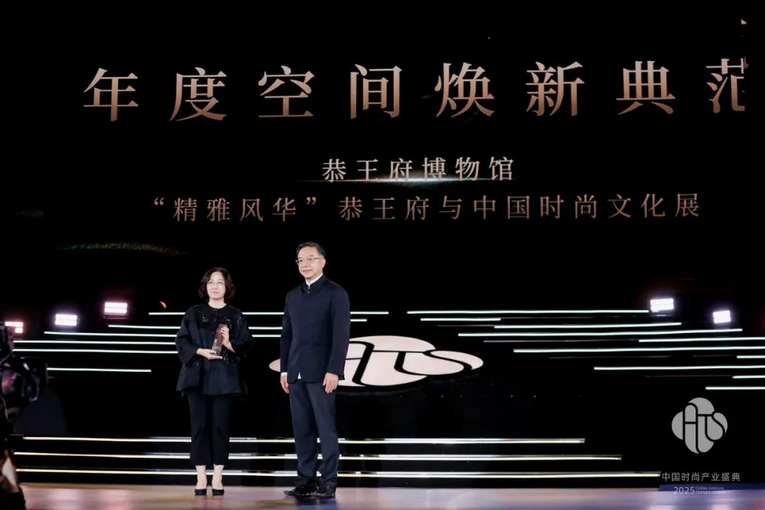 在“时尚中国之夜”上,恭博展览项目“精雅风华——恭王府与中国时尚文化”荣获“年度空间焕新典范”奖项。展览以恭王府建筑场景为线索,以服装为载体,将定制时装、数字艺术与非遗工艺融入古建空间,打造了历史场景与先锋时尚共生的新范式,不仅展示了中国设计师对传统文化的时尚解读,更通过“博物馆+学术+商业”协同创新模式,为观众呈现了一场视觉与文化的盛宴。去年11月,该展览走出国门,在新加坡成功展出,让世界见证了中国美学“以古驭今”的当代生命力,今年7月,展览将在恭王府博物馆开启国内巡展首展,继续以全新视角演绎中式生活美学。