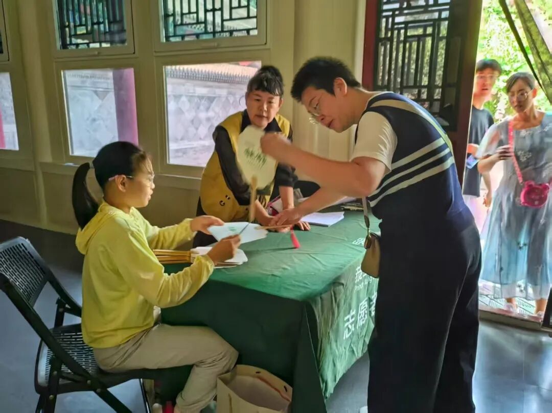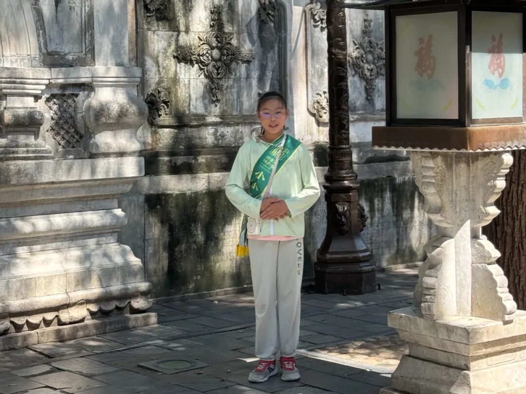 张伟老师是一位文博爱好者,2024年加入恭王府博物馆志愿者团队。今年女儿小升初,一放假,她就带着女儿来体验如何做好志愿服务。第一天,小景文跟在妈妈身边做些辅助工作:背水壶、拿讲解器,不时细心地提醒观众“小心台阶、慢点儿走”。遇到年龄相近的小朋友,她很自然地陪他们说笑聊天。张伟没想到,女儿第一次当小志愿者就能做得这么从容周到!