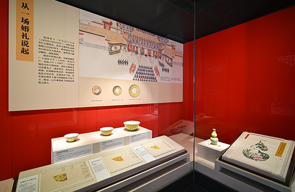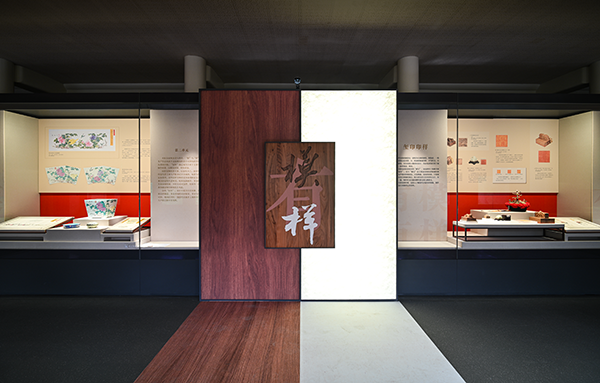 在清代,烫样、图样与做法说明等共同服务于建筑设计与营建,各有侧重、相辅相成。同样,模型与图样在当时社会生产生活的各个方面都发挥着不可替代的作用。第二单元“有模有样”,展出了一批故宫博物院收藏的图样、模具与依样做成的实物。从一幅《同治大婚彩棚图轴》的设计图样说起,重点展示了以同治皇帝大婚瓷、慈禧太后专用瓷等为代表的瓷器画样,以及印样、冠样、鞋样、活计样、点心模子等日常宫廷器用的设计图样和模型,并同时展出对应的器物文物,很多藏品为首次展出。十余组不同类型的官式图样、模具与对应器物文物并置展出的场景,实属难得一见。这些图样、模具与依样做成的实物,串联起宫廷礼仪和日常生活的多样场景,也使观众得以一窥清代宫廷手工业的设计理念、生产技艺和审美风格。