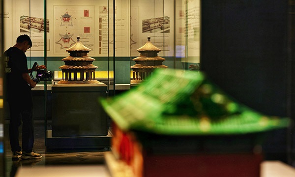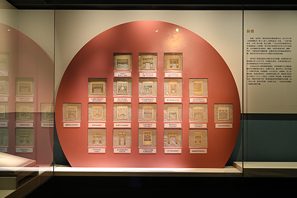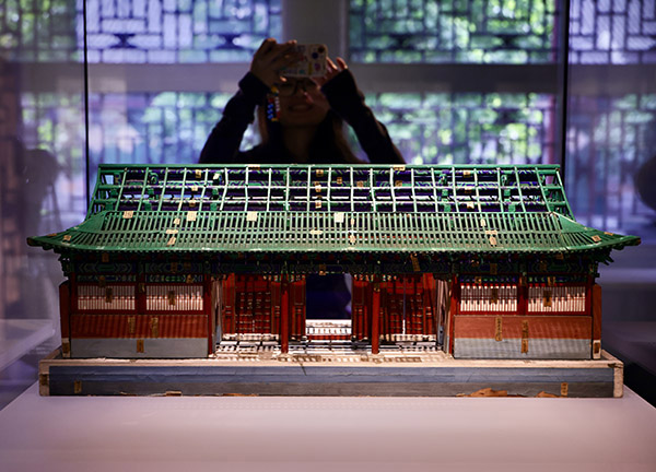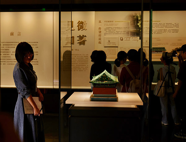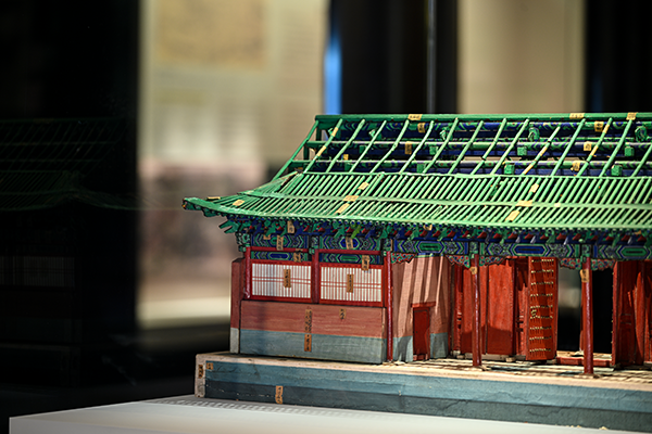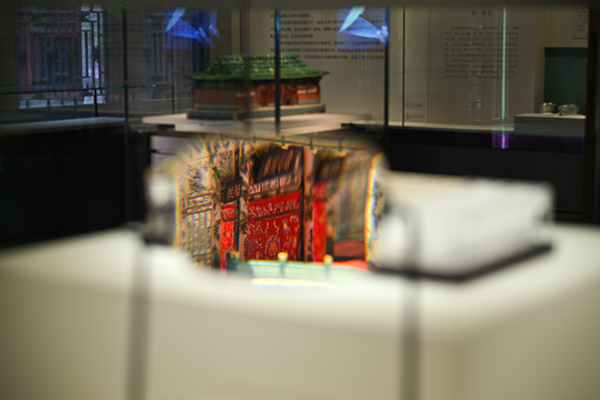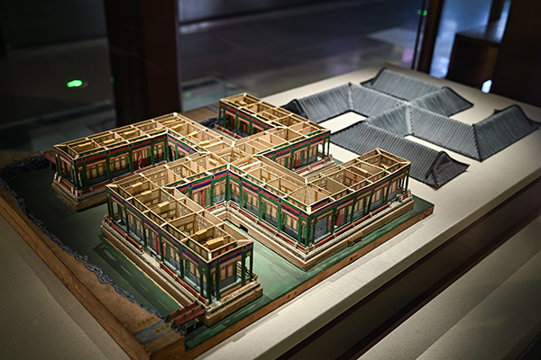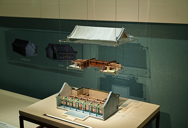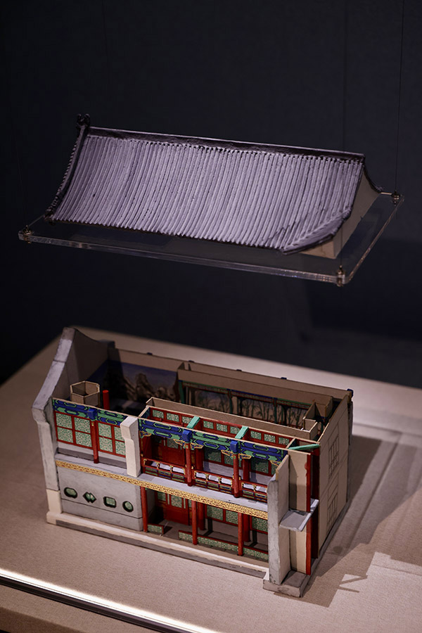 “见微知著”单元以燕寝、园居建筑为例,展现烫样、图档文物所记录的中国传统建筑精致的内檐装修和丰富的建筑外形,说明“烫样”作为核心依据之一,在清代皇家建筑“设计-审批-施工”过程中的重要作用。展出的故宫博物院藏圆明园九洲清晏殿、万方安和殿烫样,制作于清同治年间,是为重修圆明园供同治皇帝、慈禧太后等审看设计方案所做,详尽表现了建筑外形、数十槽室内装修乃至家具陈设等各项细节。一同展出的20件清华大学建筑学院中国营造学社纪念馆收藏的清样式雷内檐装修板片烫样,是该馆200多件同类藏品中第一次部分对外展示。它们有如九洲清晏殿这类大型烫样的“设计图库”,供决策者参考挑选,提出修改意见。另一件故宫博物院藏地安门烫样,做工精细,遍施彩色。展示时揭下了最上层的黄色琉璃瓦屋顶,露出结构精密的屋架结构,其上遍贴说明开间、面宽、柱高、柱径等信息的黄色签条,直观展现了烫样作为设计说明,在审批和后续施工中的作用。