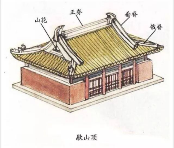 歇山式屋顶有一条正脊、四条垂脊和四条戗脊(就是屋顶最边缘分岔的那四条比较短的脊)。因为正脊比两端山墙之间的距离要短,由于其正脊两端到屋檐处中间折断了一次,分为垂脊和戗脊,好像“歇”了一歇,故名歇山顶。其上半部分为悬山顶或硬山顶的样式,而下半部分则为庑殿顶的样式。歇山顶结合了直线和斜线,在视觉效果上给人以棱角分明、结构清晰的感觉。