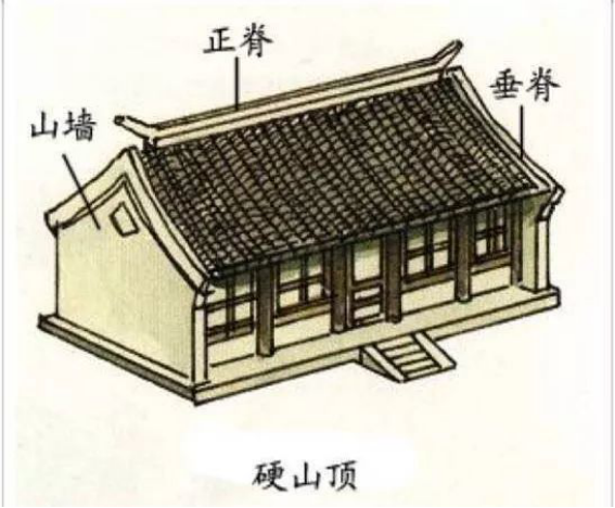 硬山式屋顶是双坡顶的一种,特点是有一条正脊,四条垂脊,形成两面屋坡。左右侧面垒砌山墙,多用砖石,高出屋顶,屋顶的檁木不外悬出山墙,凸显出建筑的庄严与气势。
