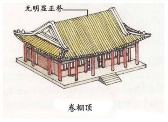 卷棚顶为双坡屋顶,两坡相交处不作大脊,由瓦垄直接卷过屋面成弧形的曲面,卷棚顶整体外貌与硬山、悬山一样,唯一的区别是没有明显的正脊,屋面前坡与脊部呈弧形滚向后坡,颇具一种曲线所独有的阴柔之美。