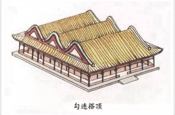 勾连搭式屋顶,就是两个或两个以上的屋顶前后檐相连,连成一个屋顶。在这种勾连搭屋顶中有两种最为典型,即“一殿一卷式勾连搭”和“带抱厦式勾连搭”。