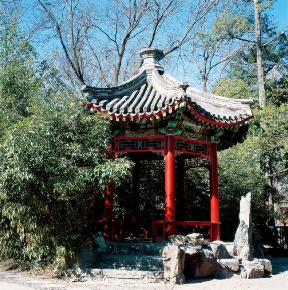 攒尖式屋顶,其特点是屋顶为锥形,没有正脊,顶部集中于一点,即宝顶。而垂脊的多少根据实际建筑需要而定,一般双数的居多,而单数的较少。如四条脊的、六条脊的、八条脊的,分别称为四角攒尖顶、六角攒尖顶、八角攒尖顶。此外,还有一种圆形攒尖顶,就是没有垂脊的。攒尖顶多用于亭、榭、阁和塔等建筑。