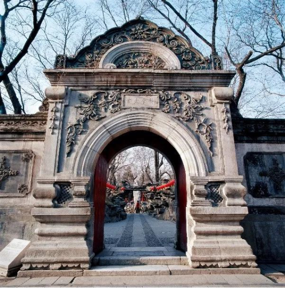 相对于圆明园的西洋门,恭王府的西洋门显然已经走出了照搬重构的老旧法式,门上石匾完全趋于传统形式,特别是门额上题写的“静含太古”“秀挹恒春”,意指处喧闹尘嚣太古之幽静,跨风霜四季留春日之秀美,颇有道家意境,更是明显带有中国传统意味。