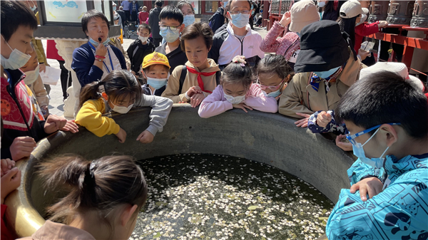 春光明媚,随着志愿者老师的脚步,40组亲子家庭步入恭王府花园参观蝠池。在志愿者老师的讲解下,小朋友们感受到中国古典造林中理水的艺术。
