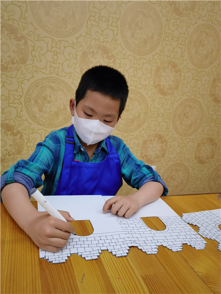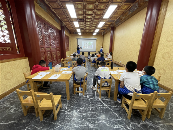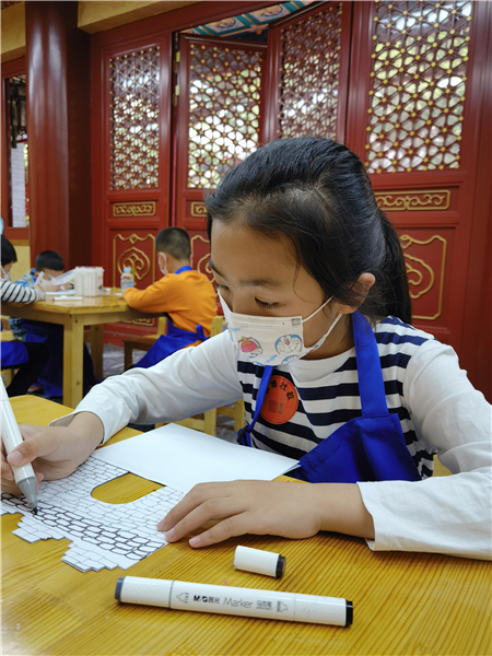 榆关是山海关的别称,体现了府主人缅怀故土,遥寄思念的情怀。参与课程的同学们在老师的帮助下,利用画笔在小小的卡纸上再现榆关古朴雄浑的氛围,体会建设之初设计者将其比拟山海关的家国情怀。