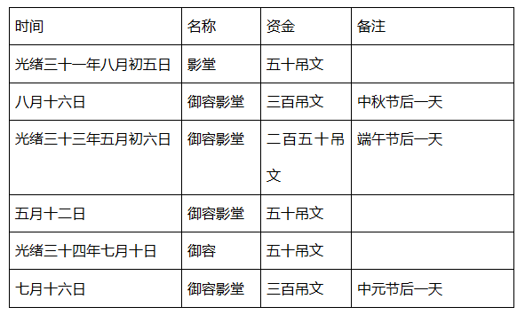 在重要的节日,如八月十五中秋节、五月初五端午节、七月十五中元节(民间称为鬼节,佛教徒称之为盂兰盆节,道教徒则称为中元节)后一天,影堂的供膳资金较大,而且在该节日前后的同月之内还伴有小资金的供膳。鉴于资料相对匮乏,恭王府家庙有待资料的发掘及进一步研究。