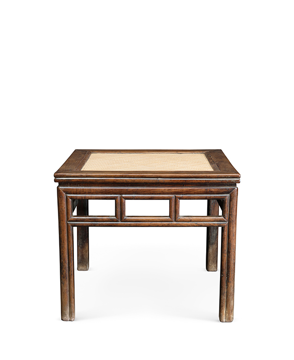 黄花黎木制,座面四角攒边框,镶藤心,面沿、腿足、直枨及矮老均为劈料做,系模仿竹藤家具的自然特色,为明式家具的一种线脚方法,虽无雕饰,而装饰效果很强。