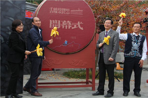 在白族调对唱《放羊调》、彝族民歌《二里半腔》、彝族三弦、阔时欢歌等精彩的展演节目中,开幕式正式开始。王静副馆长首先致欢迎辞,张碧伟、李建华、刘魁立三位嘉宾依次致辞,钟建波、王静、张碧伟、李建华四位领导共同为展览击鼓开幕。