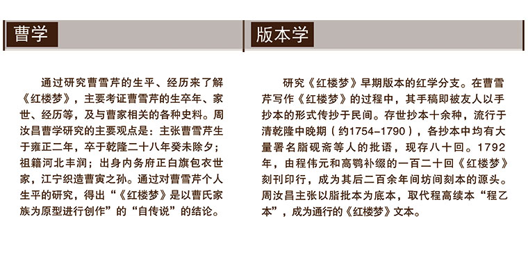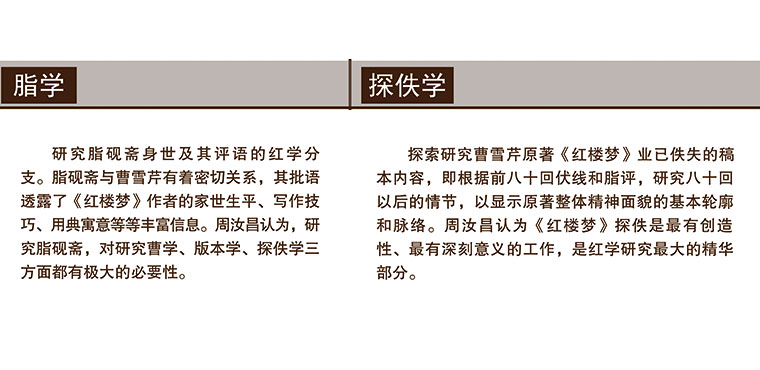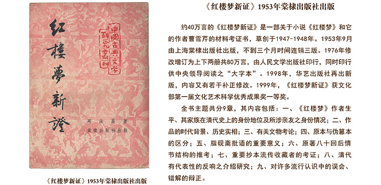 《红楼梦新证》以考证为据,涉及《红楼梦》研究有关的方方面面,实可谓包罗万象。自1953年初版,至1976年修订再版,经过二十余载不断地充实提升,周汝昌红学研究的体系化理论日趋形成,进而于上世纪80年代初提出了“曹学”、“版本学”、“脂学”、“探佚学”四分支,奠定了新红学的基础。这也正是其代表作《红楼梦新证》80万言所探讨的核心课题。
