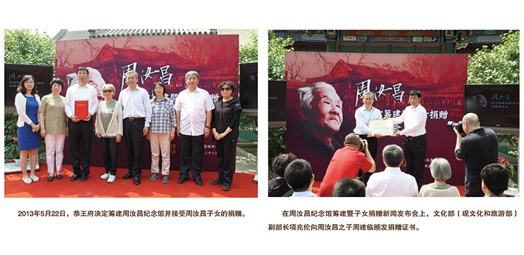 2013年,在周汝昌逝世一周年之际,恭王府决定在恭王府花园内特辟专厅建立周汝昌纪念馆。在新闻发布会上,其子女宣布将周汝昌生前的全部资料捐赠给恭王府,作纪念馆展览、收藏之用。在此后将近3年的时间里,经过周家子女的精心整理,共向恭王府捐赠文献文物23000余件。