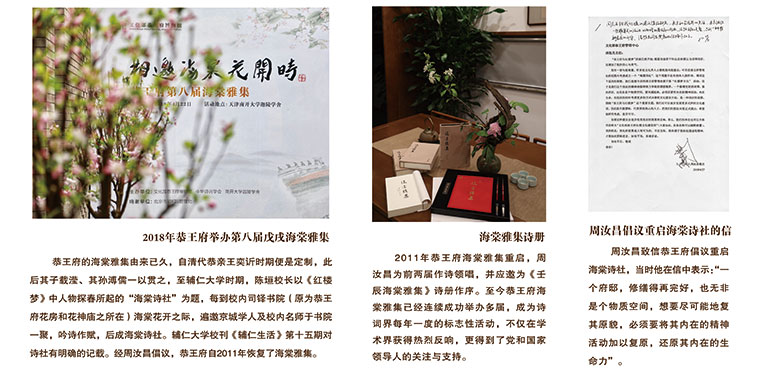 周汝昌对恭王府的关注与关心从未间断,他晚年仍然致力于恭王府历史文化的研究与保护,在恭王府的史料梳理、景物流变、文化传承等诸多方面做出大量工作,为恭王府全面开放后的文化事业发展做出巨大贡献。2010年他致信恭王府倡议重启海棠诗社,并与恭王府合作录制讲述恭王府与《红楼梦》关系的讲座资料。当时93岁高龄的周汝昌表示:搞了60年的红楼梦考证,考证很多,但有一项最得意的就是考证了恭王府与红楼梦的关系,自己义不容辞、当仁不让的要与恭王府合作,把这项成果系统地整理保存起来,留给社会。