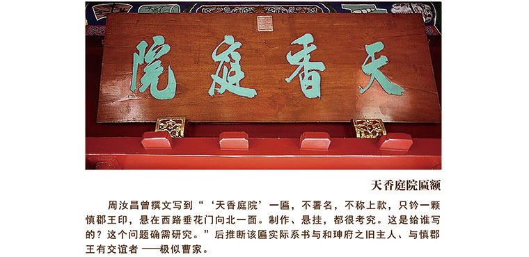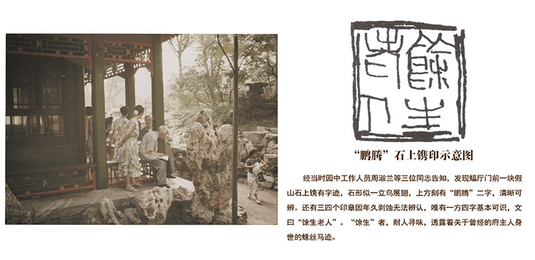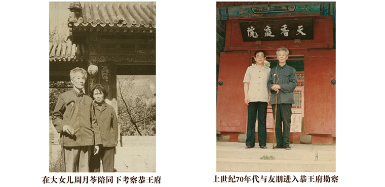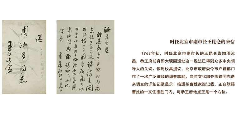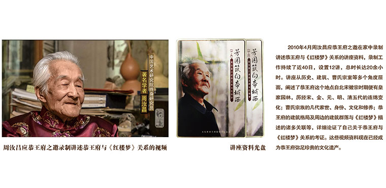 1954年5月,周汝昌奉调回京后着手重拾考证“大观园遗址”的课题,他与四兄周祜昌及友人多次在恭王府周边地区考察地理位置、建筑、桥、河,采访父老见闻,并进入恭王府勘察,由于当时园子被不同单位占用,先后周章四次才得以看全了前府后园。上世纪70年代,周汝昌不断进行更加深入细致的考证工作,寻找大观园遗址的蛛丝马迹,逐步证明了恭王府花园中旧石刻为和珅入府之前遗迹,湖石假山本身及叠法为明代或清初遗物,并研究康熙福字课题,写成考园文字三万余言。