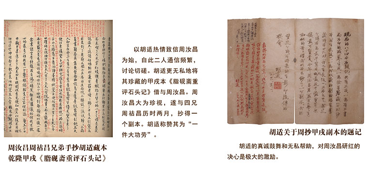 周汝昌极力倡导推动新校《红楼梦》版本的流通,终生致力于《石头记》的汇校大业。数十载的研红生涯,周汝昌一方面围绕红学的核心课题考据、阐释、著书、讲授;另一方面与四兄祜昌积50年苦功对《石头记》各存世版本进行汇校。