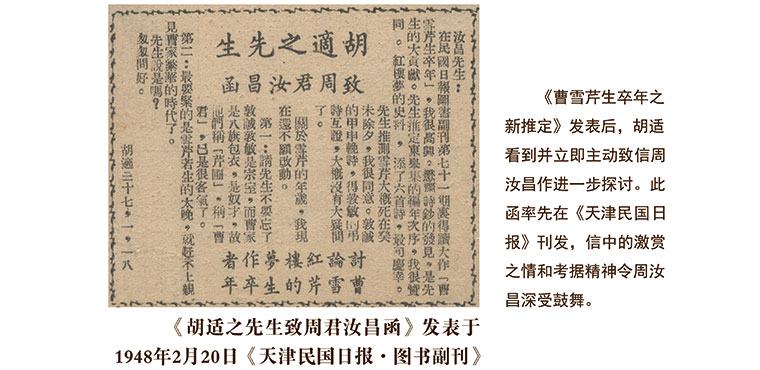 《曹雪芹生卒年之新推定》一文于1947年12月5日在天津《民国日报·图书副刊》发表,立即引起时任北京大学校长胡适的关注,他致信周汝昌,称赞《懋斋诗钞》的发现这一“大贡献”,并就相关学术问题进行了探讨。《新推定》一文的发表,打破了红学沉寂二十多年的沉闷局面,使新红学重新获得学术动力,并引起后来红学上种种环节的发展。