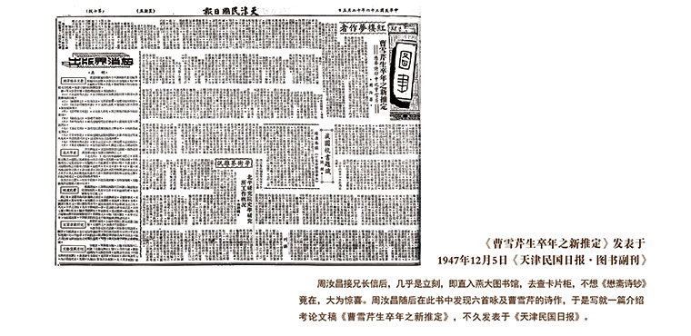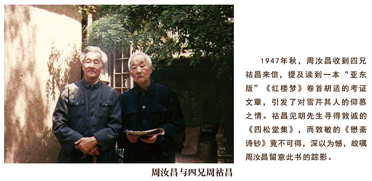 回归燕园不久,周汝昌接到四兄周祜昌来信,嘱其到燕大图书馆尝试查一部诗集。正是这一举动,促成了周汝昌《曹雪芹生卒年的新推定——<懋斋诗钞>中之曹雪芹》一文的诞生,也正是由此,周汝昌走上了研究曹雪芹和《红楼梦》的道路,并成为了他毕生最主要的事业。
