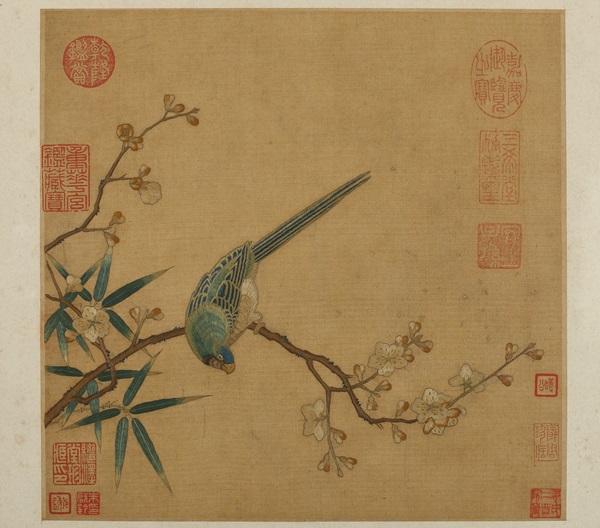 此幅纵27.2厘米,横27.7厘米。以典型的工笔花鸟画为稿本,绢地刺绣梅枝横斜,竹叶掩映,一只红嘴鹦鹉伫立于枝头,转首下窥。鹦鹉色彩绚丽,以长短针和套针,用劈丝细线依照鸟羽生长方向退晕刺绣,末端加施毛针表现羽毛的质感。翅膀和尾羽用深浅不同的蓝、绿色线层层绣出重叠丰厚的逼真效果,栩栩如生。鸟爪扎针,树干长短针绣地,再用扎针绣出纹理。花瓣单色或两色线套针绣,花蕊打子针。这是深刻领会原作精神、熟练掌握表现技巧的艺人倾注心力完成的作品。