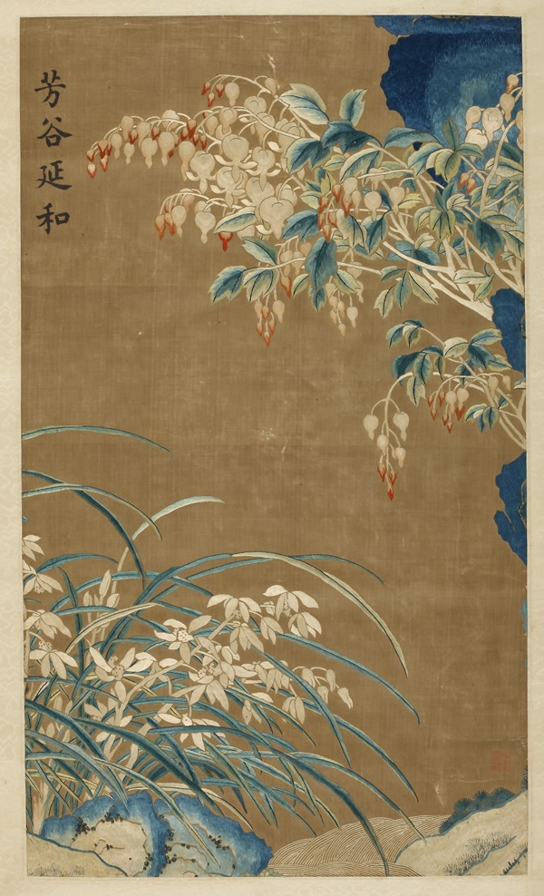 此图绫地绣山水小景,岩石上长出含苞牡丹,地上水仙花开放,小溪潺潺流过。左角题楷书“芳谷延和”四字。构图精巧雅致,内容富贵吉祥,绣工细腻严谨,应为清宫绣品。花、叶、岩石用长短针,针脚工整严密,兰草交叠处留出水路,水仙花繁叶茂而不乱,极具绘画效果。水波纹用滚针层层施绣。整幅画面只有花蕊、部分苔点和小草稍加补笔。