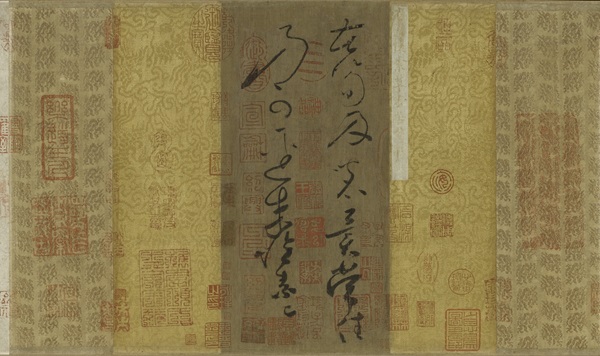 怀素书法多为醉书于“粉壁绢裳”而难以保存,传世亲笔墨迹《苦筍帖》因此显得尤为珍贵。此帖后有宋米友仁、明项元汴等人的题识,及“宣和”“政和”“欧阳玄印”“乾隆御览之宝”“恭亲王章”“贝勒载滢”等鉴印。
