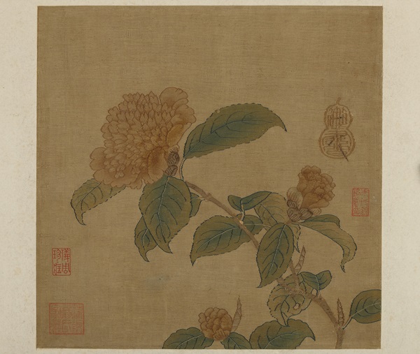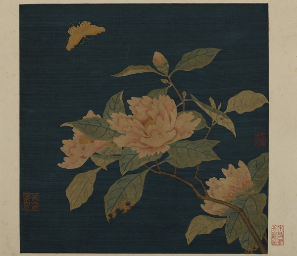 册页纵25.6厘米,横25.3厘米。蓝地织设色水红山茶花一枝,澹逸古雅。旁缂粉蝶,展翅轻盈,栩栩如生。枝头枯叶,有虫齿痕,尤为精绝。左下角缂织“朱克柔印”。右钤“令之清玩”朱文印一。此本为安岐(仪周)所藏唐、五代、宋集册之引首,见《墨缘汇观》名书卷下等三则。乾隆时入清内府,汇入《宋刻丝绣线合璧册》,著录于《石渠宝笈重编》。