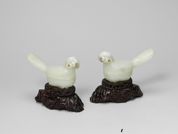 玉鸟为一对,高8.26厘米,宽15.24厘米,白玉质,玉白如脂。形状呈鸟形,昂首直立,口衔多头灵芝,灵芝上分别镶嵌玫瑰石英和翡翠。鸟的上半身包括头和尾构成盒盖,下半部呈卵圆形碗状。爪子和羽毛雕刻极为精细。玉雕下有形似鸟巢的木座。整体造型栩栩如生。