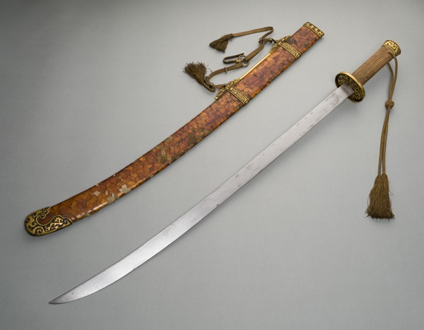 该刀是道光二十九年(1849年),道光帝赐予奕䜣的,同时恩准配用金桃皮刀鞘。这种刀鞘为清宫专属,非特赏不能用。