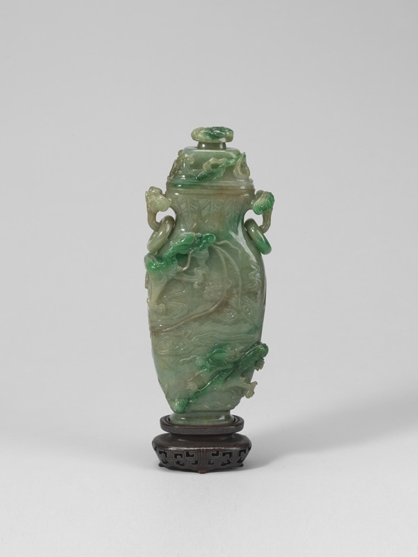 此瓶为翡翠质地,高19.05厘米,宽7.62厘米。扁瓶形,瓶上有盖,盖顶盘龙,盖面饰灵芝纹。瓶颈浅雕蕉叶纹。颈肩处有灵芝形双耳,内有活环。瓶身主题纹饰为一条神龙在滚动的云层中穿梭,转过身来面对下面的小龙,画面栩栩如生。此瓶运用深浅不一的雕刻方式,令纹饰巧妙地重叠、穿插,生动有力地呈现出泱泱大国皇家苍龙教子的景象。